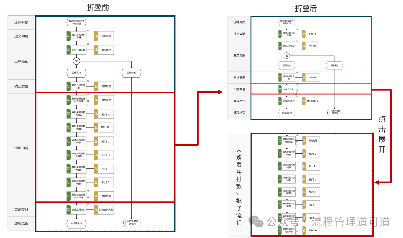 在上图所示的“L4子流程:设备采购费用付款流程”展开的由 “活动” 构成的L5级流程图中,“审批流” 部分较为复杂。有时,为了让流程图显得简洁一点,流程设计人员将复杂的 “审批流” 简化为一个环节,称为 <采购付款审批子流程>,点击展开才能看到这段复杂的 “审批流”,相当于对这段 “审批流” 进行了折叠处理。