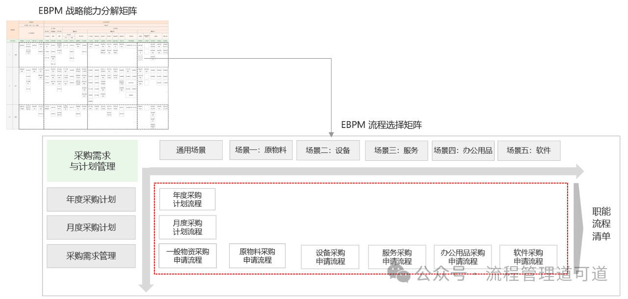 如上图所示,EBPM 方法论中从能力到流程的解析过程中,有一个《流程选择矩阵》,基于末级能力项<采购需求管理>解析流程时,不同业务场景下解析出了不同的 “采购申请流程”。