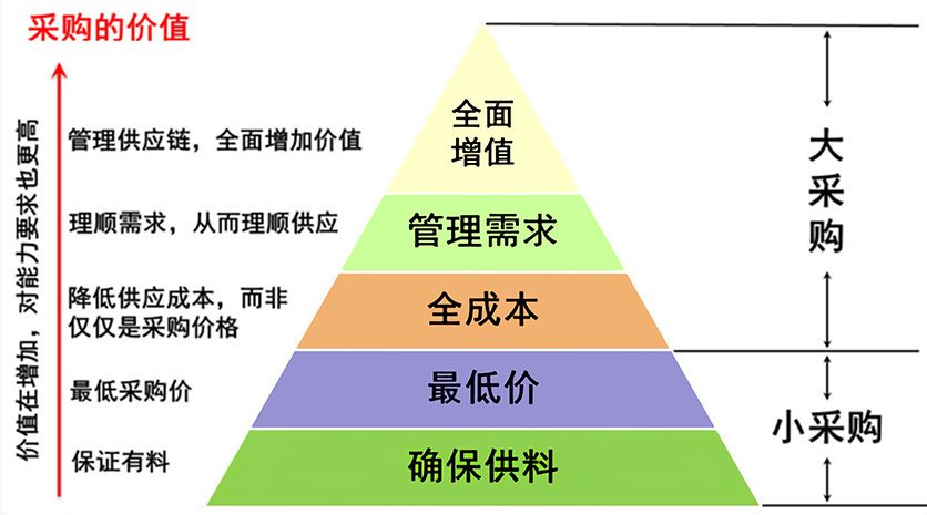 哈克特集团(The Hackett Group)有一个采购管理的发展模型,把采购分为五个发展阶段:确保供料、最低价、总成本、需求管理和全面增值,也代表了从“小采购”到“大采购”的发展路径,如图。
