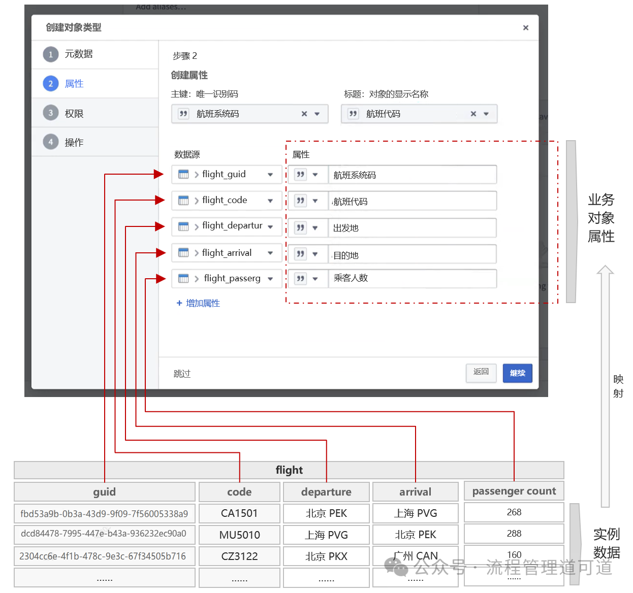 1)「对象类型」已绑定 「源数据表」,并完成了字段映射(列 → 属性)、主键(Primary Key) 与标题键(Title Key) 配置。