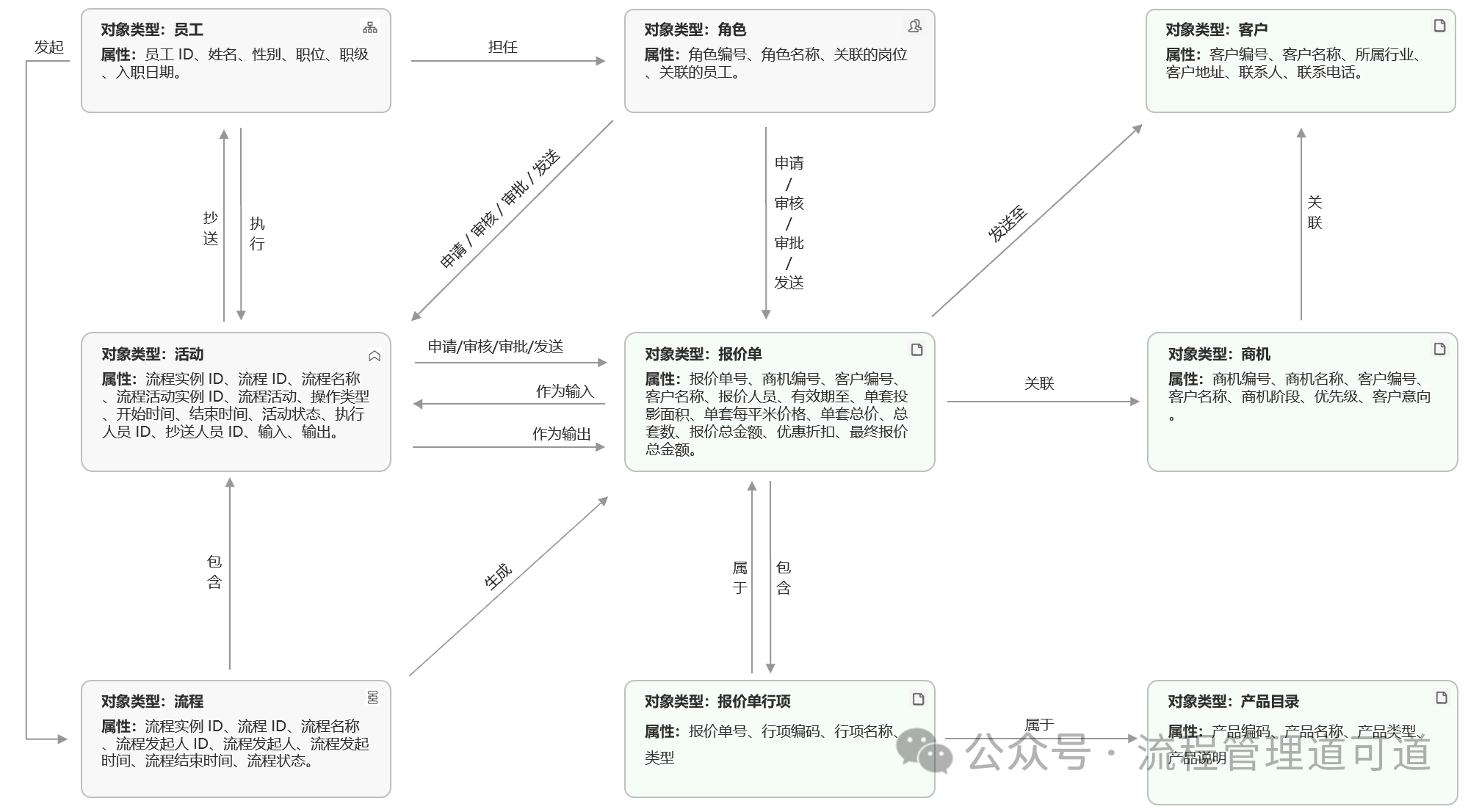 在上两篇文章中,我们以博阳家居的【销售报价流程】为例,构建了上图所示的【流程-数据模型】和「流程本体模型」,进而证明了当【流程-数据模型】构建完成后其实「流程本体模型」也同步构建完成了,因为「流程本体模型」中需要描述的内容和语义,在【流程-数据模型】中已经完整描述了。