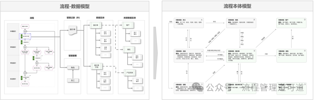在上图右侧的示例中,将【流程-数据模型】加入了业务过程数字化的工程化落地过程。