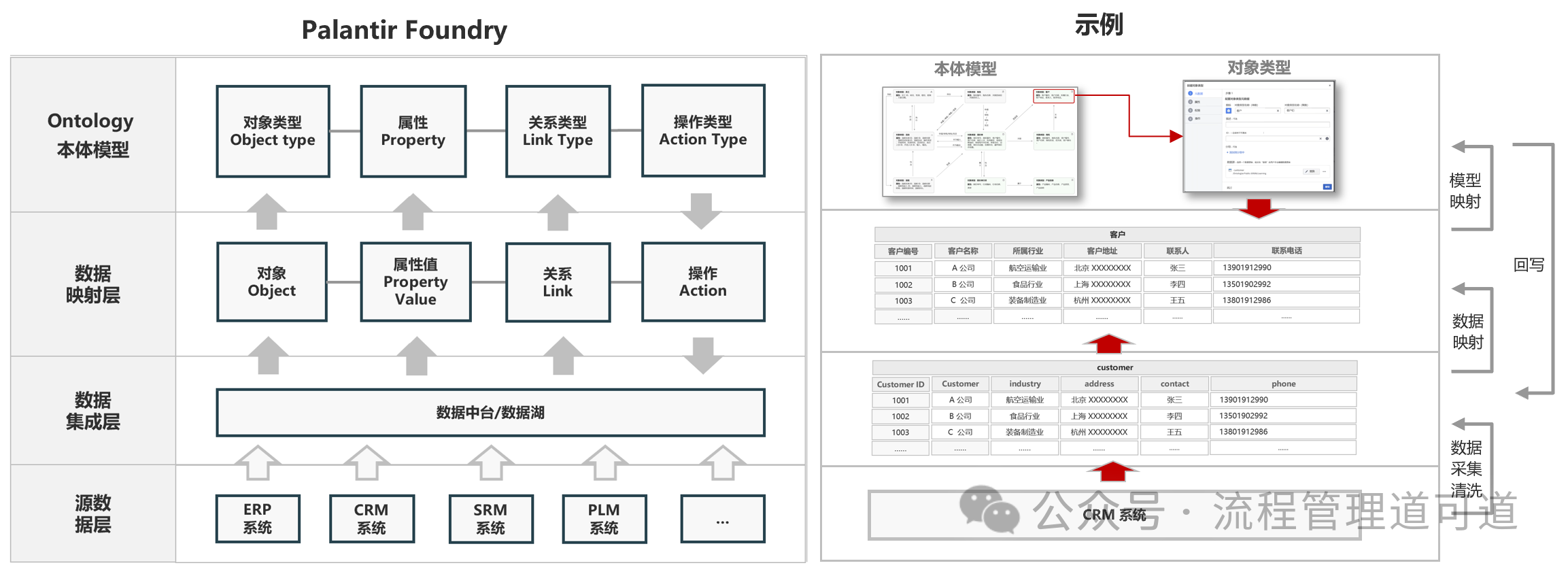 因此,构建一套统一的企业管理体系模型,并以这套统一模型作为唯一的数据映射基准,是业务过程数字化成败的关键。按照 Palantir 的设计逻辑,企业只应存在一个业务语义层,这就是其核心的「本体模型」。