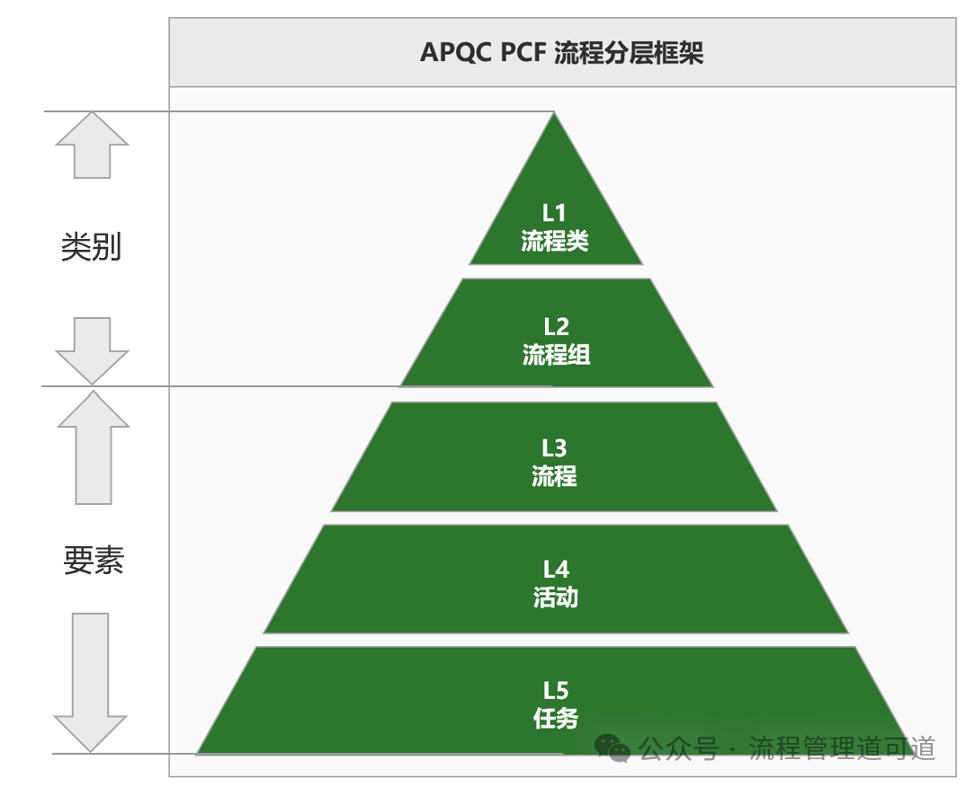 上图所示是APQC PCF 流程分级框架。APQC 建议企业的流程架构分为五级。以下是 APQC PCF 官方文档中关于这五个层级的定义:
