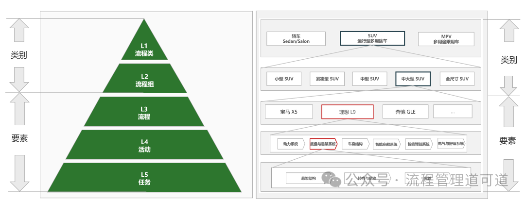 同样,将【L4:底盘与悬架系统】展开得到的 L5 则是此部件的构成要素,包括:【L5:悬架结构】、【L5:转向与制动】、【L5:车轮】,在车辆运行时这些零部件是直接起作用的,是直接参与运行的。对于流程架构而言,【L5:任务】也是直接参与流程运行的。但 【L1:流程类】和【L2:流程组】不是直接参与流程运行的。