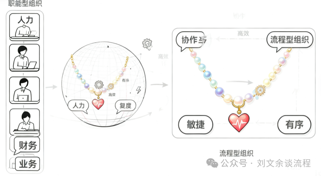 您可能会想,我们的职能型组织运行了这么多年,似乎也没什么大问题,为什么现在要转向流程型组织?这是因为,我们所处的商业环境已经发生了根本性的变化。首先,市场竞争日益激烈,客户要求更快的响应速度、更个性化的产品和服务。职能型组织内部复杂的审批链条和部门墙,使得企业像一头笨重的大象,难以快速转身。其次,业务复杂度急剧提升,企业的产品线、市场范围不断扩大,跨部门的协作成为常态。在职能型组织下,协调成本高昂,内耗严重,“屁股决定脑袋”的现象屡见不鲜。另外,“人治”的局限性凸显,企业规模较小时,依靠领导人的英明决策和强力推动可能有效。但当企业成长为巨无霸时,个人的精力和管理半径有限,必须依靠一套不依赖于任何个人的、可重复成功的规则系统,即流程。