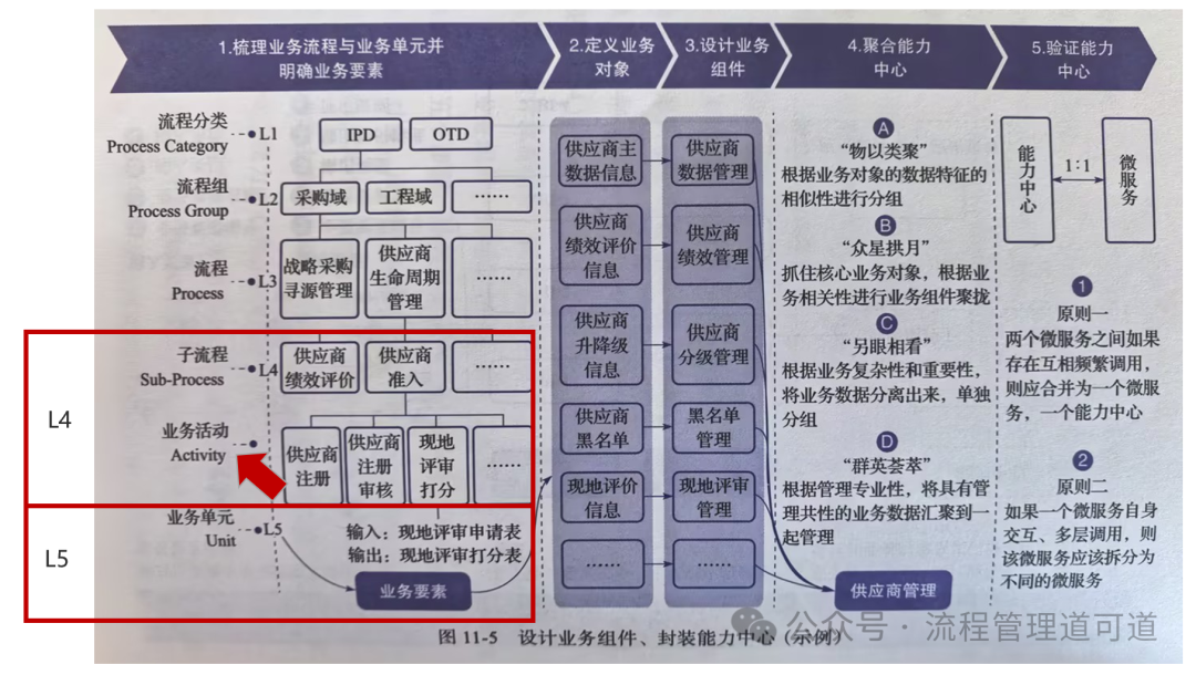 如上图所示,在《迈向数智化-中国一汽组织与业务变革之路》第200页的【图11-5】中, 【L4 子流程】下方赫然出现了【业务活动】这一级。但是,图中没有将这一级标为 L5,L5 的名分给了 “业务单元”。所以,“活动”这一级是存在的,只有没有 “名分” 而已!