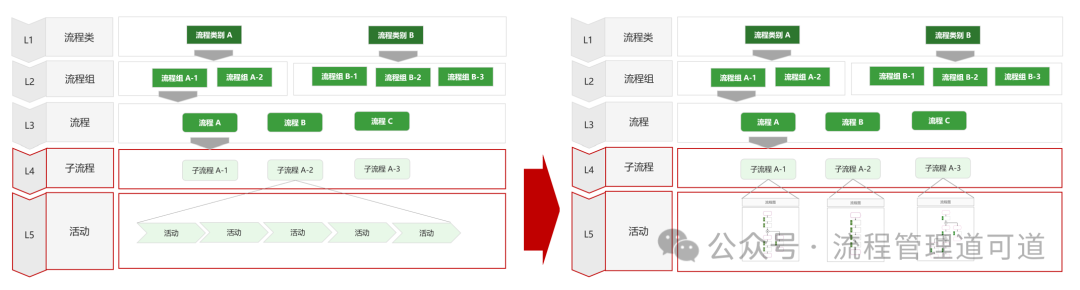 下面我们详细说明一下【流程名称】和【流程图】共同构成一级流程的现象。如上图所示,【L4 子流程】再往下拆解已不是 “流程”了,而是构成流程的动作类要素【L5 活动】,即一个 “子流程” 由一组 “活动” 构成。如上图右侧所示,构成一条 “子流程” 的一组【L5 活动】,通常可以绘制成一张流程图,所以我们也可以这么说【L4 子流程】展开是【L5 流程图(活动集)】。