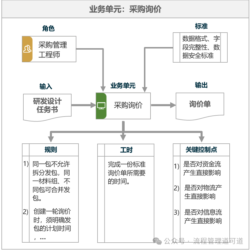 现在,再仔细看看一汽【业务单元】的构成要素:输入、输出、角色、标准、规则、工时、关键控制点,哪个都不是描述动作的要素。非要往上靠,也只有 “规则” 有点可能,通过 “规则” 描述如何一步步操作完成一个活动?但看看书上给出的上图所示的业务单元的示例,似乎不太像!