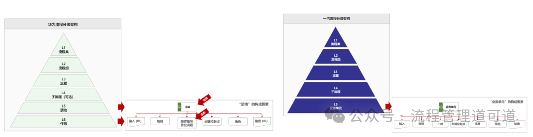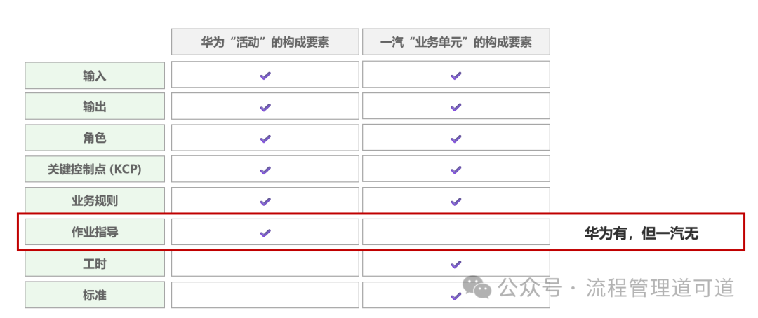 下面, 我们再仔细看一下上图所示的对比表,可以发现 “作业指导” 这类要素,华为是有的,但一汽没有。而上表左侧的所列的所有要素中,只有 “作业指导” 是对操作过程的描述,是描述动作的要素。也就是说,由于 “作业指导” 这类要素的存在,表明华为认为一个 “活动” 还可以进一步拆解为一组 “操作过程”,其中的每一个 “操作” 动作也就是所谓的 “任务”。但一汽没有此类要素,也就是说一汽认为 “活动” 从动作角度不可以再拆分了。再次强调:“活动” 这个要素在一汽的流程分级架构中是客观存在的,只是没有给其一个名分而已,而【L5 业务单元】是 “活动” 构成要素的总称。